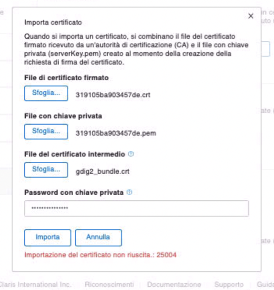 Dopo aver regolarmente generato e scaricato i certificati SSL da GoDaddy (sia per server “mac” sia per altri “tipi server”) importiamo i tre file scaricati e riscontriamo l’errore 25004. Quale può essere il problema?